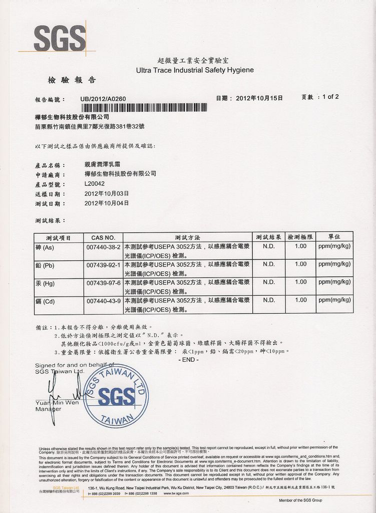 苾兒可天然保養品_親膚潤澤乳霜重金屬檢驗報告